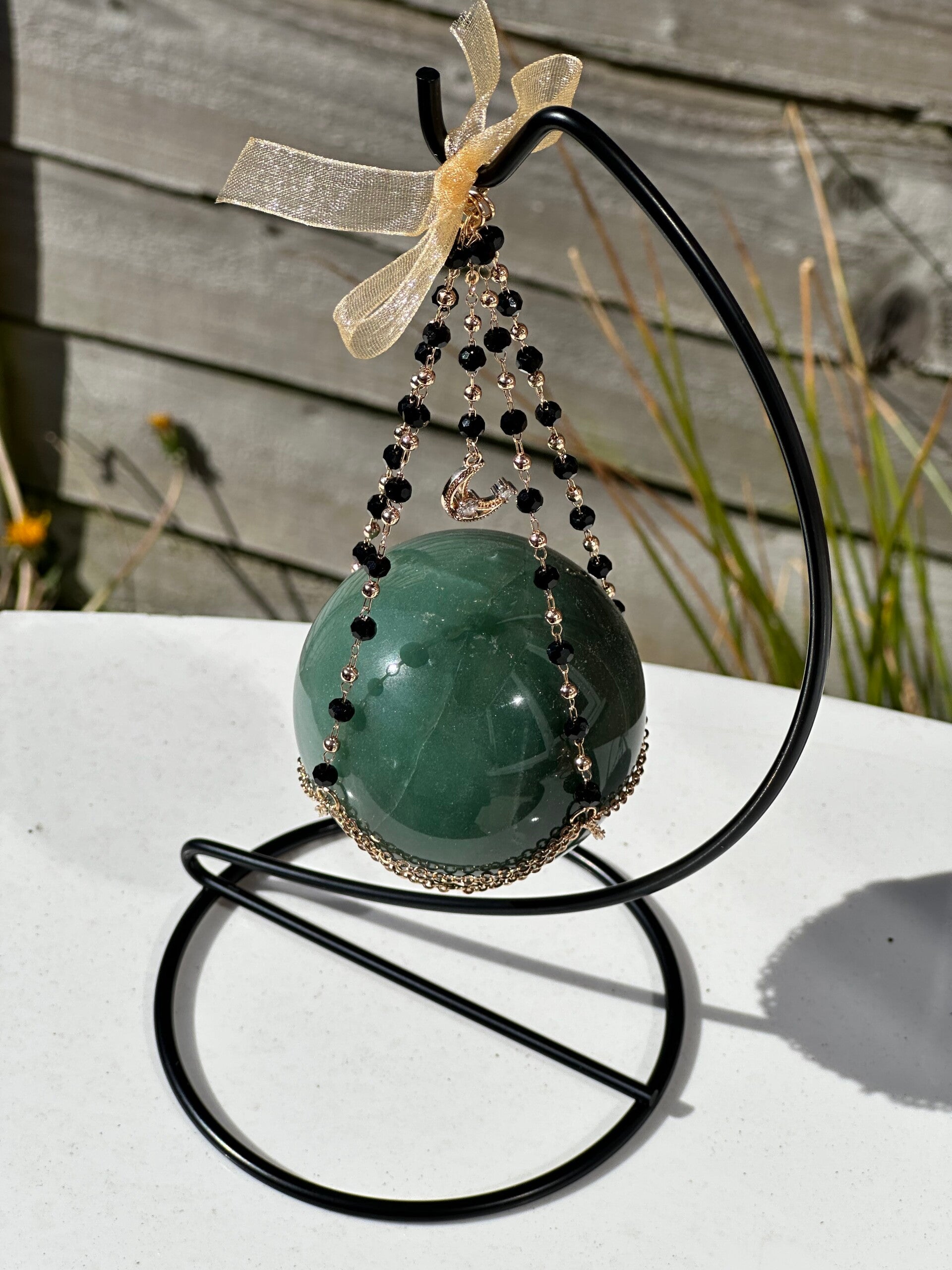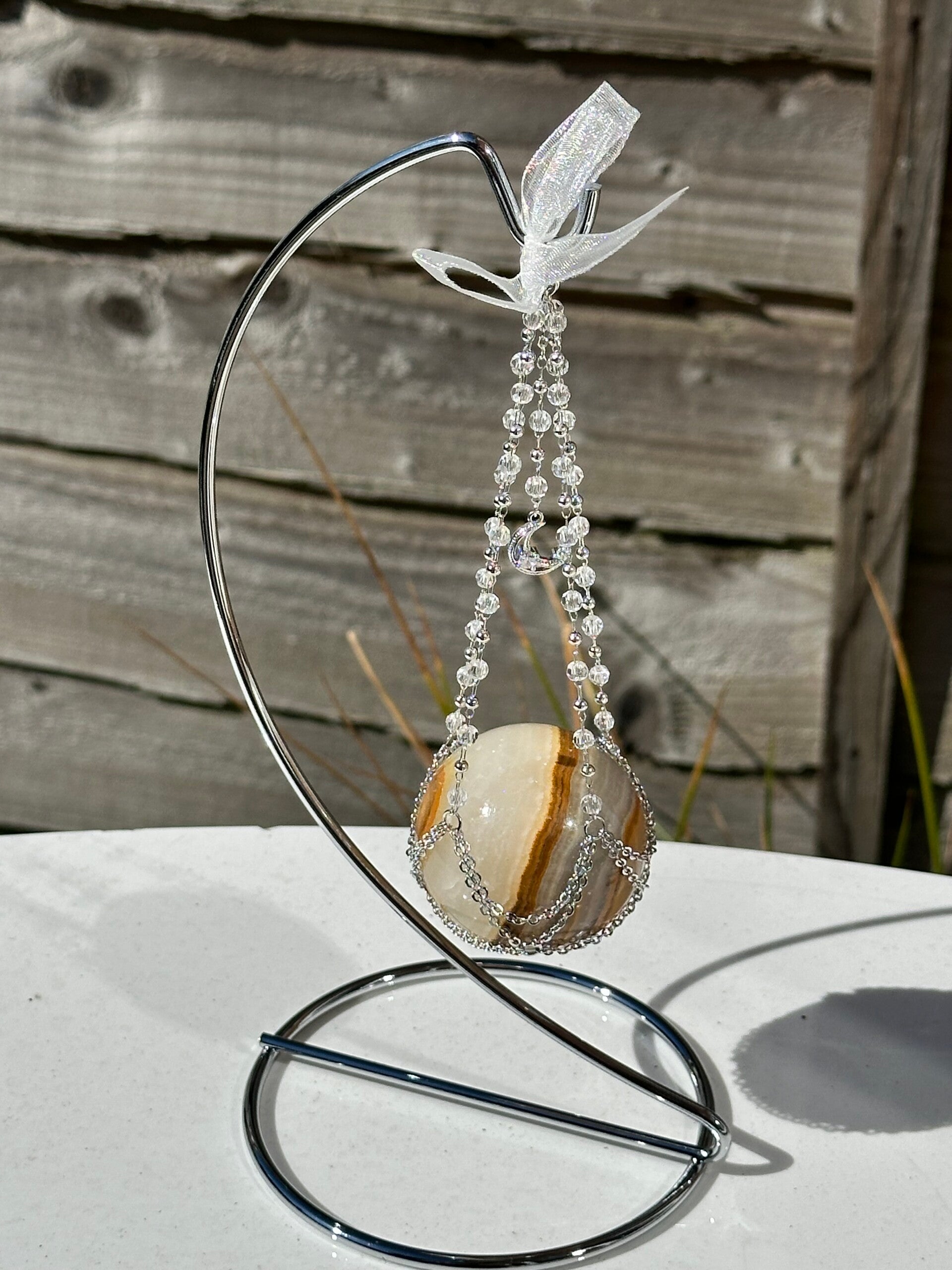 Showcase your crystal spheres in style with this handcrafted swing holder, designed to add a touch of elegance and whimsy to any sacred space or display area. Suspended with delicate beaded strands and finished with a ribbon, each swing cradles your sphere like a celestial ornament.